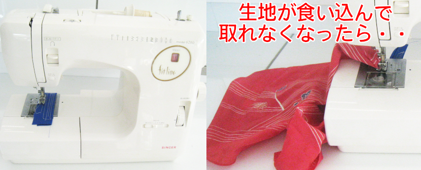 東京都内北区からご来店されたお客様の電子ミシンで「布地が針穴に食い込んで取れない」という症状です。