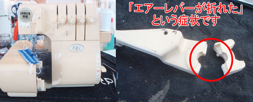 さいたま市中央区からご来店されたお客様の4本糸ロックミシンで「エアーレバーが折れた」という症状です。