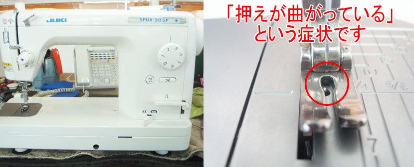 埼玉県さいたま市大宮区からご来店されたお客様の職業用ミシンで「押えが曲がっている」という症状です。