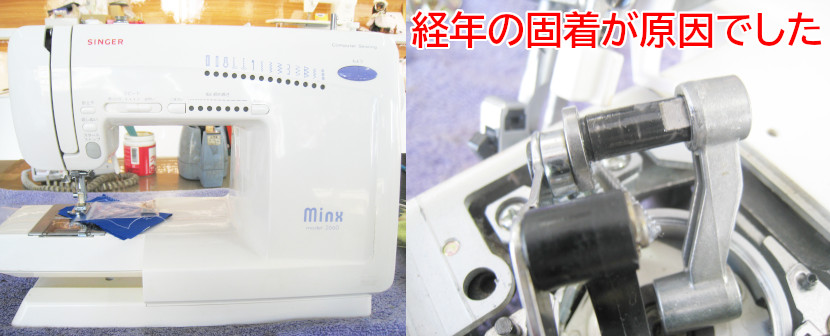 経年の固着が原因なので、オーバーホール・内外部クリーンアップでスムーズに縫えるように修理させていただきました。