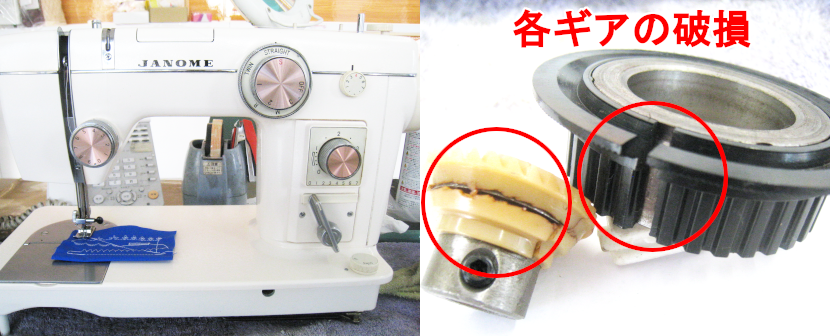 各ギアの破損が原因なので、オーバーホール・部品交換でスムーズに縫えるように修理させていただきました。