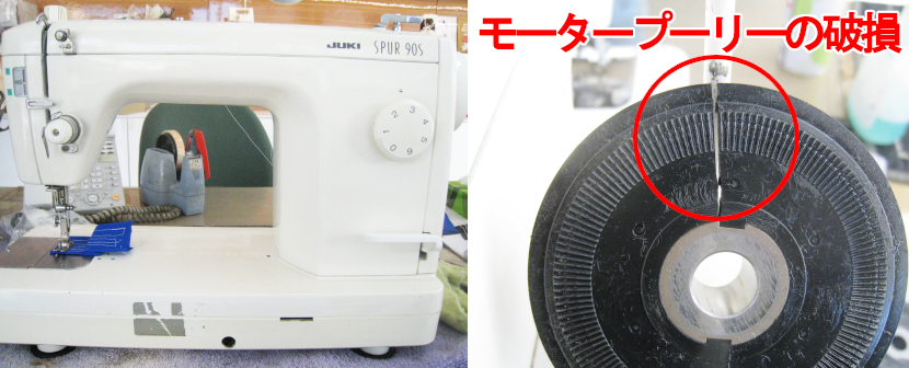 モータープーリーの破損が原因なので、オーバーホール・部品交換でスムーズに縫えるように修理させていただきました。