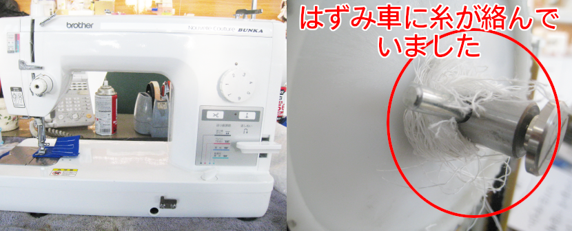 はずみ車に糸が絡んでしまったことが原因なので、部分的分解・お掃除でスムーズに縫えるように修理させていただきました。