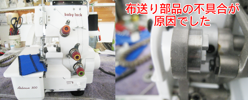 布送り部品の不具合が原因なので、オーバーホール・部品交換でスムーズに縫えるように修理させていただきました。