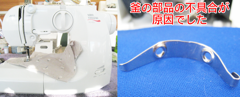 釜の部品の不具合が原因なので、部分的分解・部品交換でスムーズに縫えるように修理させていただきました。
