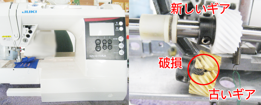 このタイプに良くある駆動ギアの破損が原因なので、オーバーホール・部品交換でスムーズに縫えるように修理させていただきました。