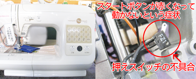 押えスイッチの不具合が原因なので、オーバーホール・スイッチ交換でスムーズに縫えるように修理させていただきました。