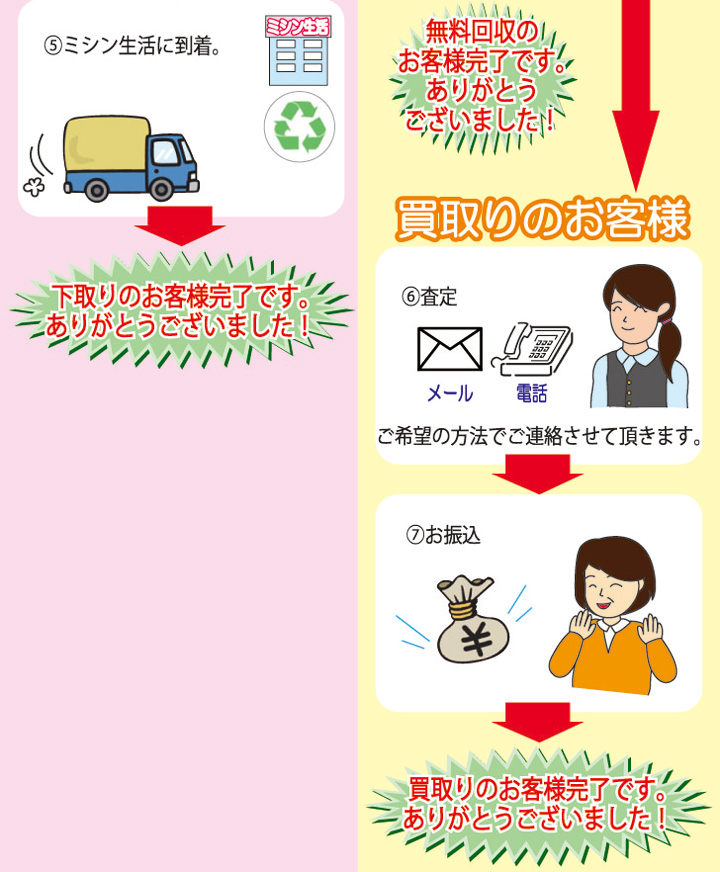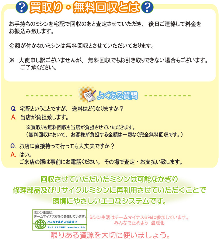 お客様のミシンは、整備のうえリサイクル中古ミシン及び部品が無くて修理不能な古いミシンを修理するために再利用させていただきます。