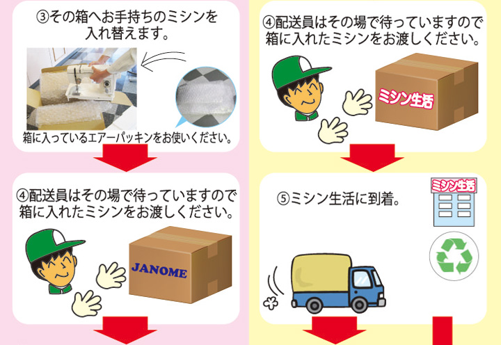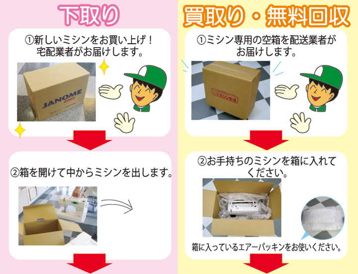 家庭用ミシン、職業用ミシン、ロックミシンをご自宅までミシン専用ボックスで買い取り・下取り・無料回収させていただきます。
