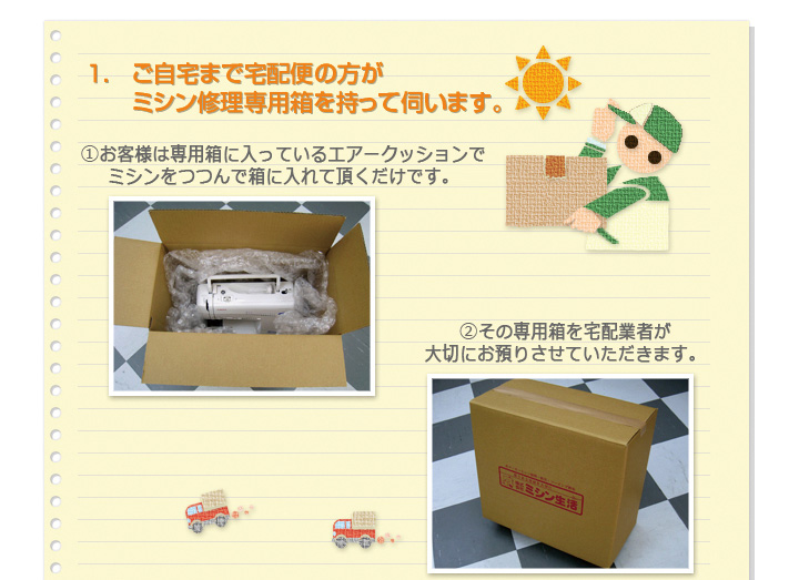 過去には何度か破損してしまったことがあります。そのためミシンの梱包はヤマトさんにお任せではなく、必ずお客様ご自身ですき間のないよう梱包・チェックをお願い致します。