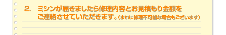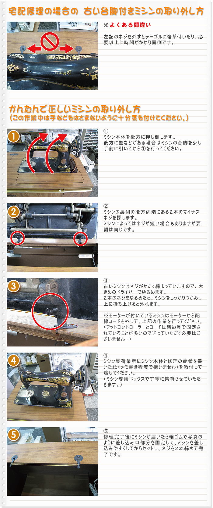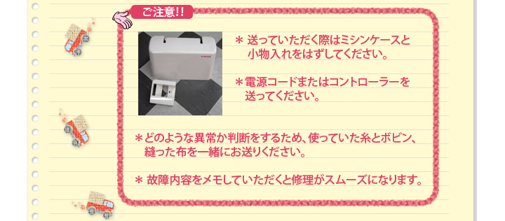 - 【必ずお読みください】弊社でお預り後ご連絡の取れなくなってしまったお客様のミシンに関しましては、大変恐れ入りますが3ヶ月を経過したらこちらで処分をさせていただきます。何卒ご理解の程お願い申し上げます。