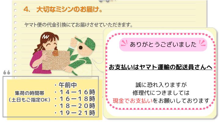 - ミシンご返却を希望・・送料4,800円分を、代引きでお支払いいただくようになります。