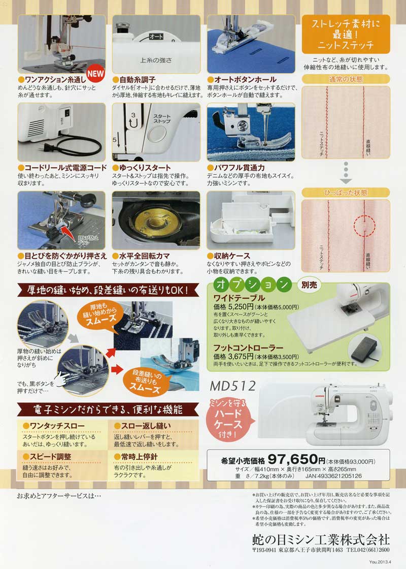 | カタログ | ○ | 特徴 | 現在販売中の人気ミシン。 |