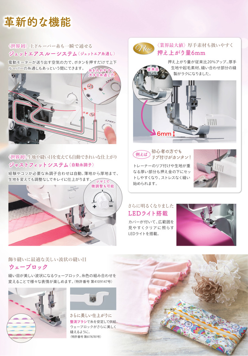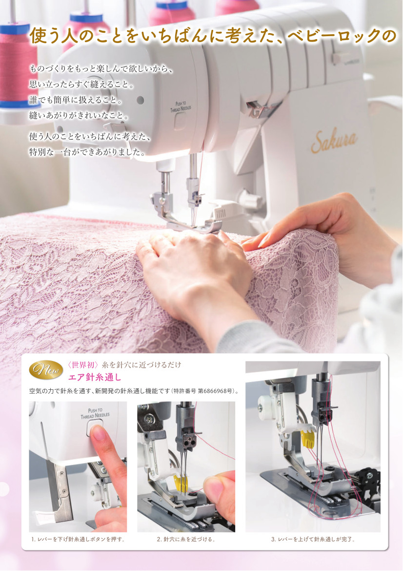 - 空気の力でサッと糸通し、エアースルーシステム(自動エア糸通し)。