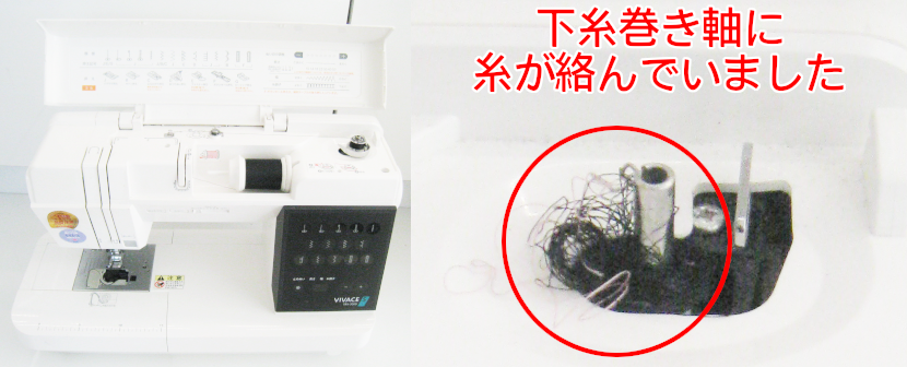 下糸巻き軸に糸が絡んでいたことが原因なので、部分的分解・お掃除でスムーズに巻けるように修理させていただきました。