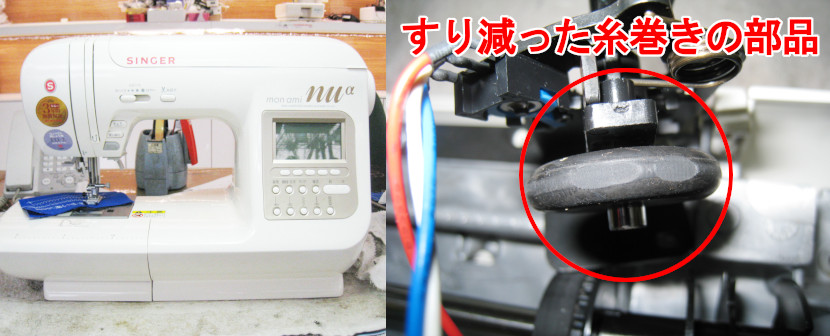 ミシンの宅配修理で集荷させていただいたお客様のコンピュータミシンで「糸巻きの中に糸が絡んだ」という症状です。